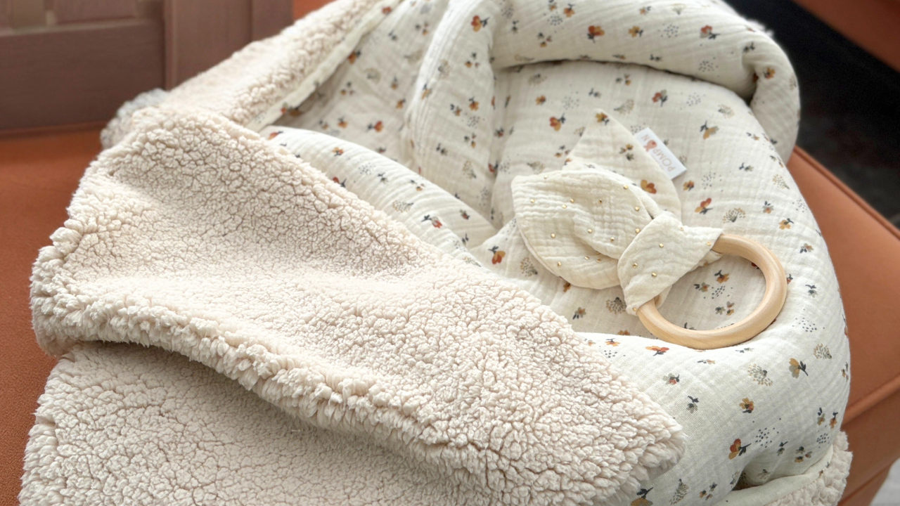 Couverture bébé animaux de la savane moumoute sherpa écru