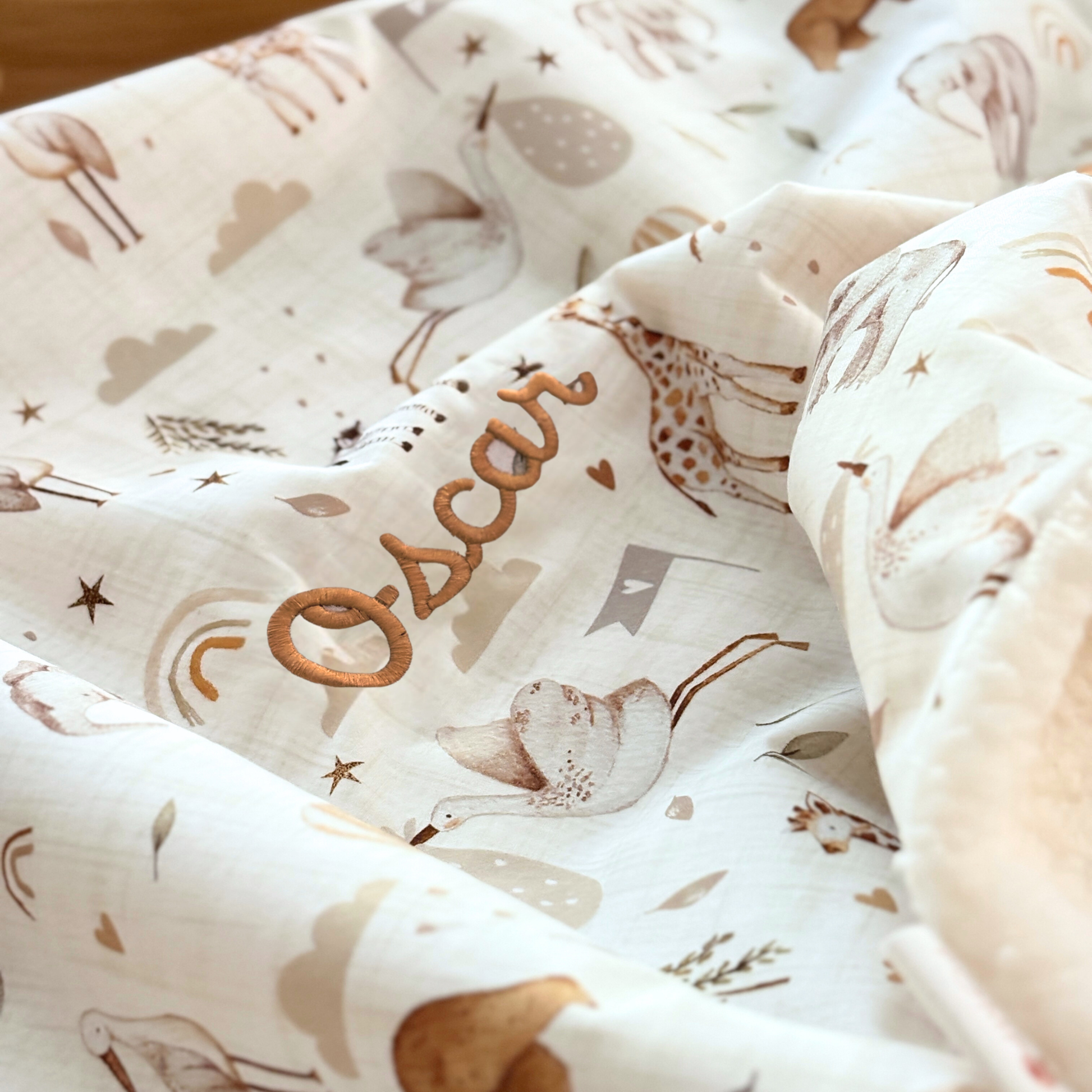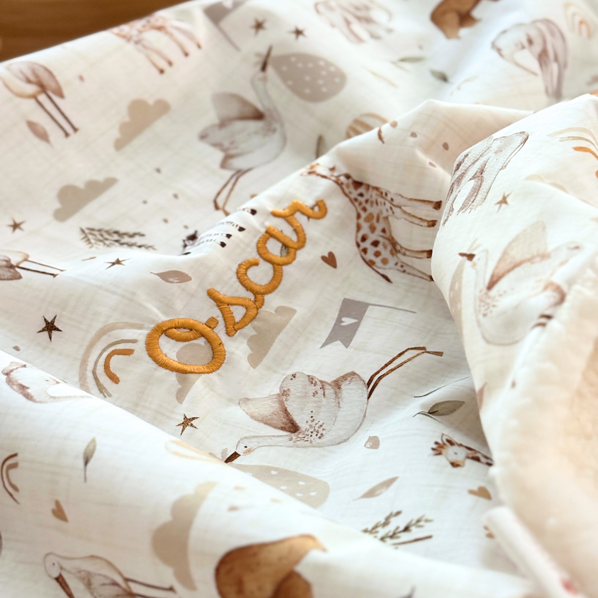 On craque pour cette magnifique couverture fait main et personnalisable sur le thème des animaux de la savane de la collection Oscar qui enveloppera bébé de chaleur pour de gros dodos tout doux !