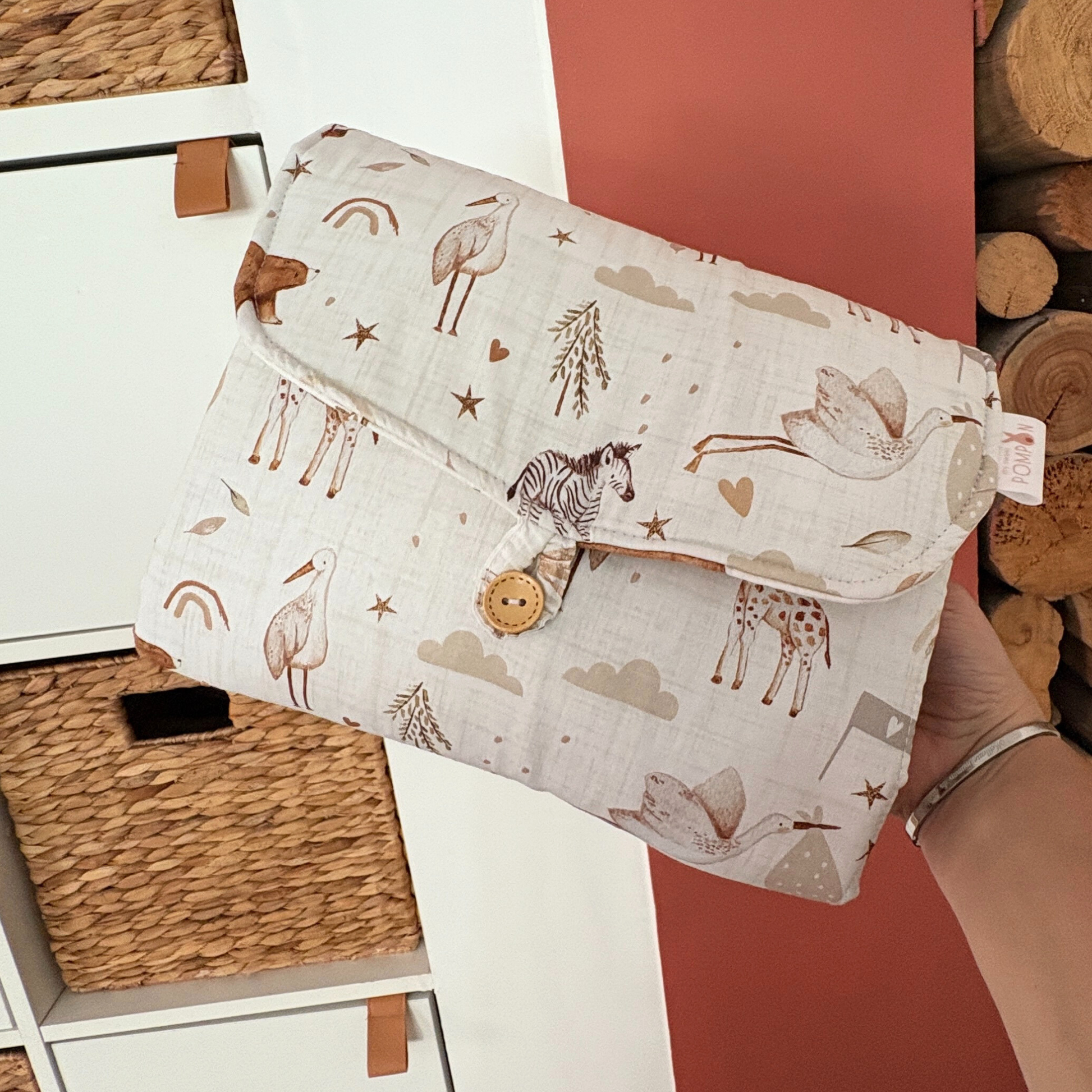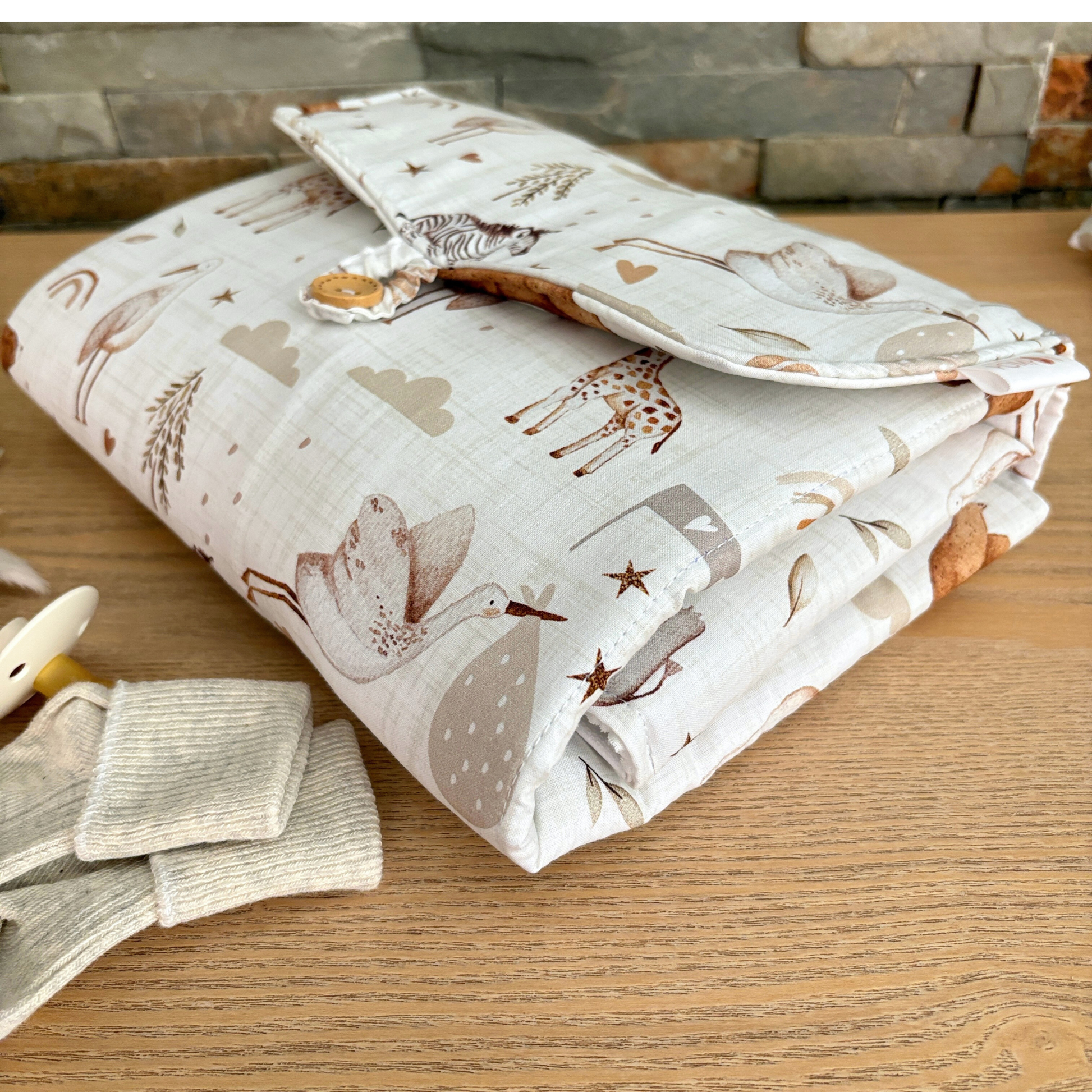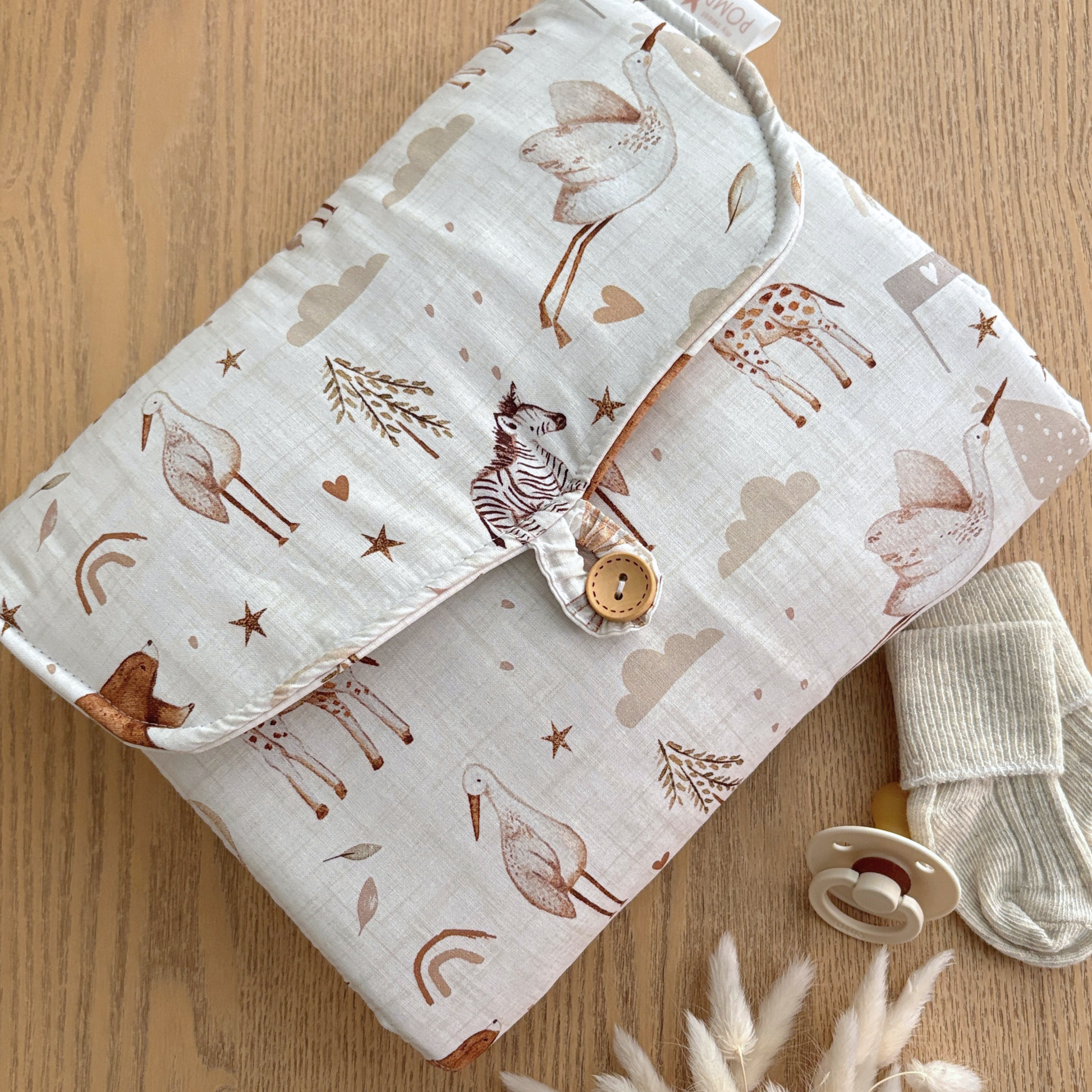 Compact, léger et facile à utiliser grâce sa fermeture par bouton (bouton en bois- motif aléatoire), il trouvera parfaitement sa place dans le sac à langer ou sous la poussette.