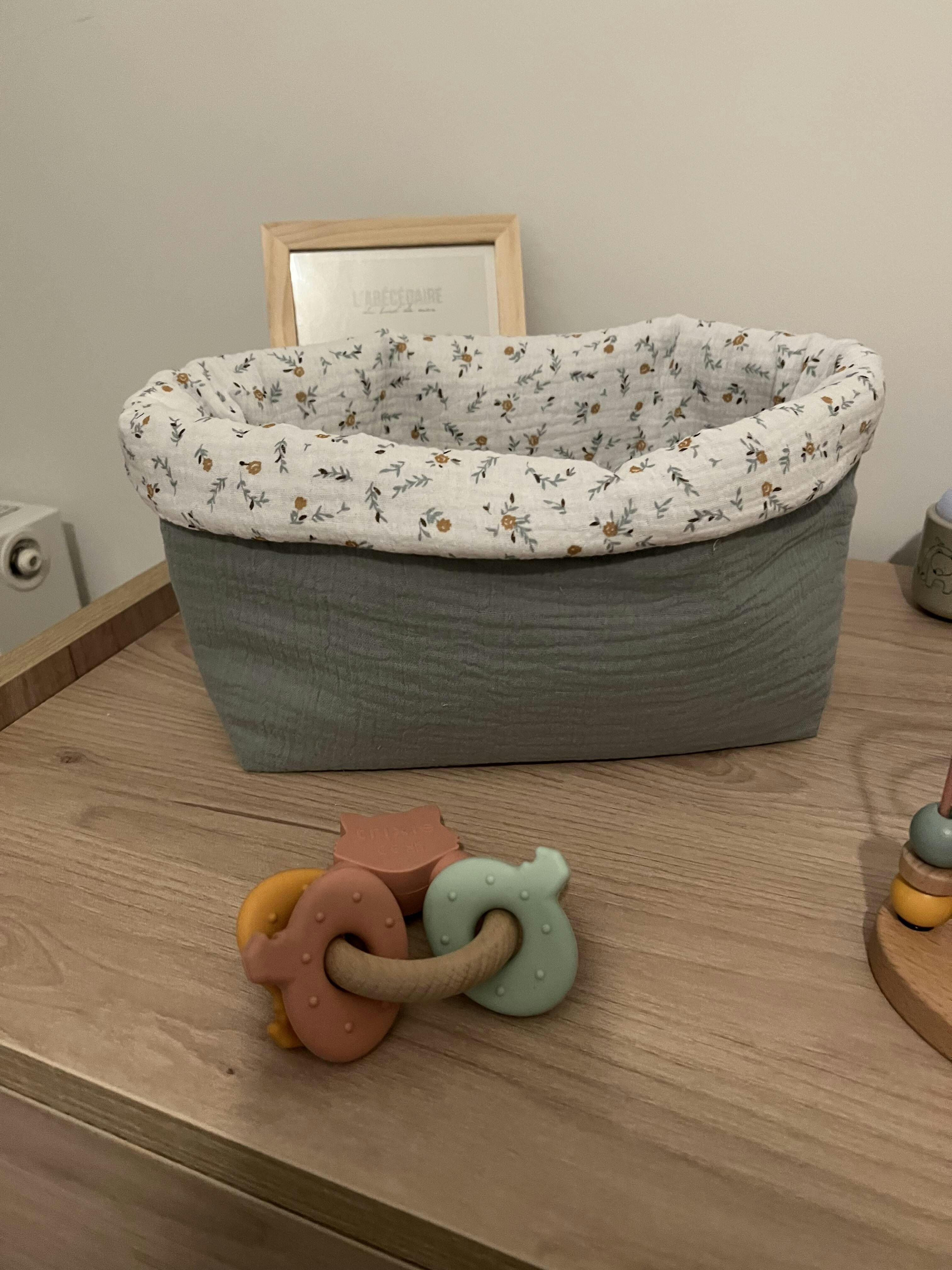 Paniers à couches et produit de soin bébé vert de gris et camel