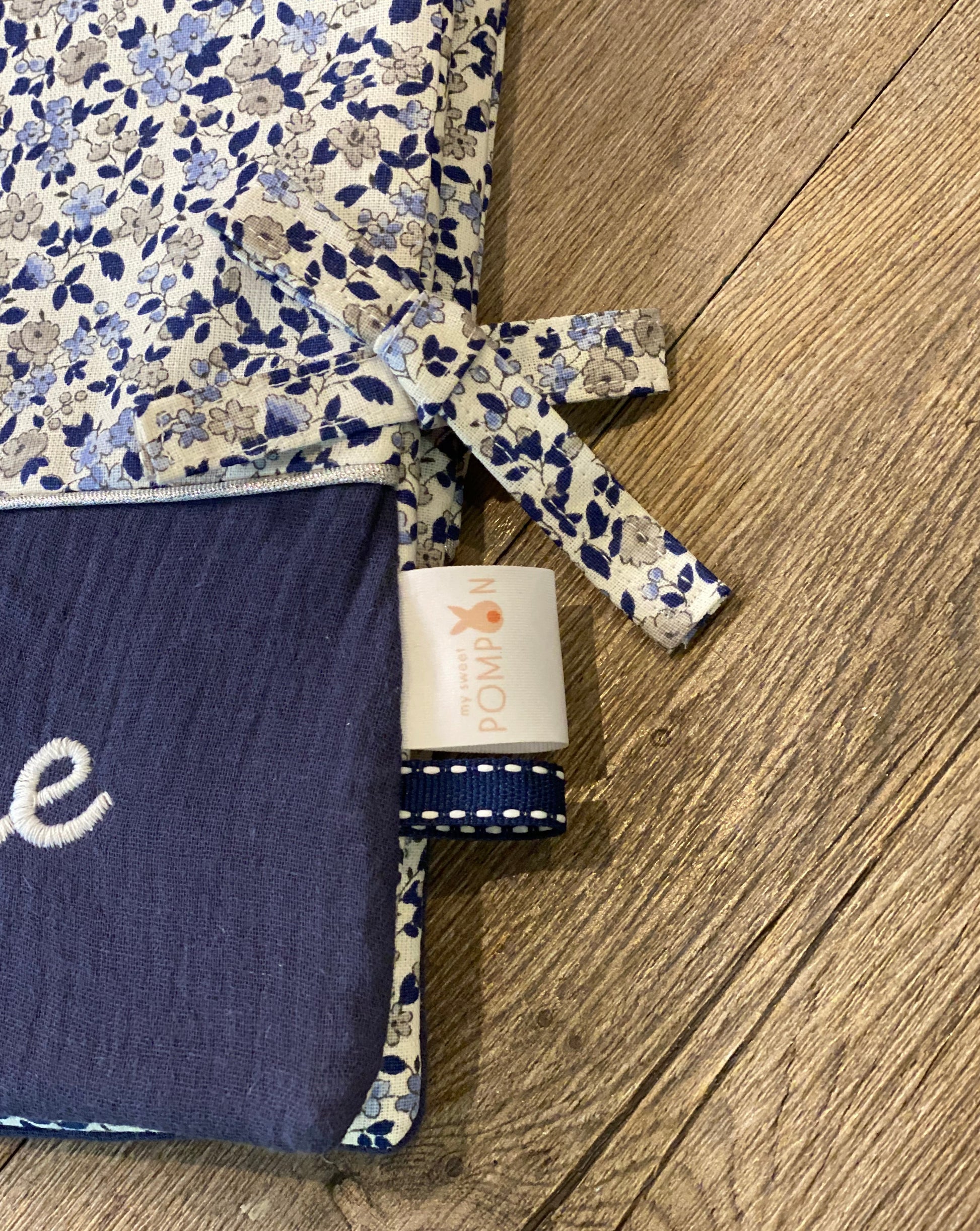 Le bandeau en gaze de coton bleu marine rehaussé par un passepoil argenté