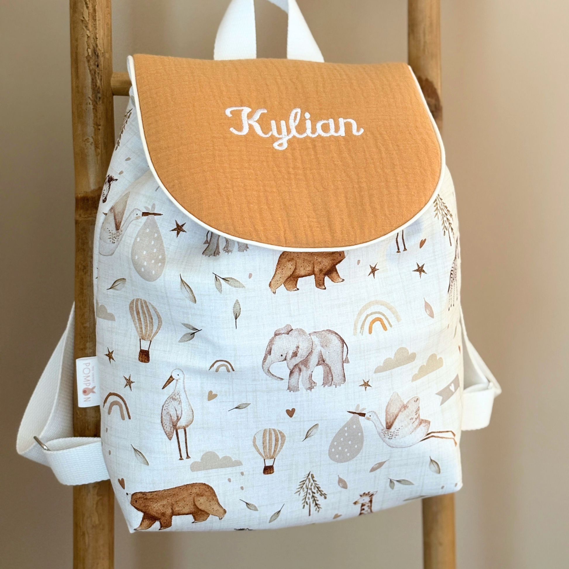Un rabat en double gaze avec broderie prénom viendra fermer le sac grâce à un bouton aimant et élastique intérieur.