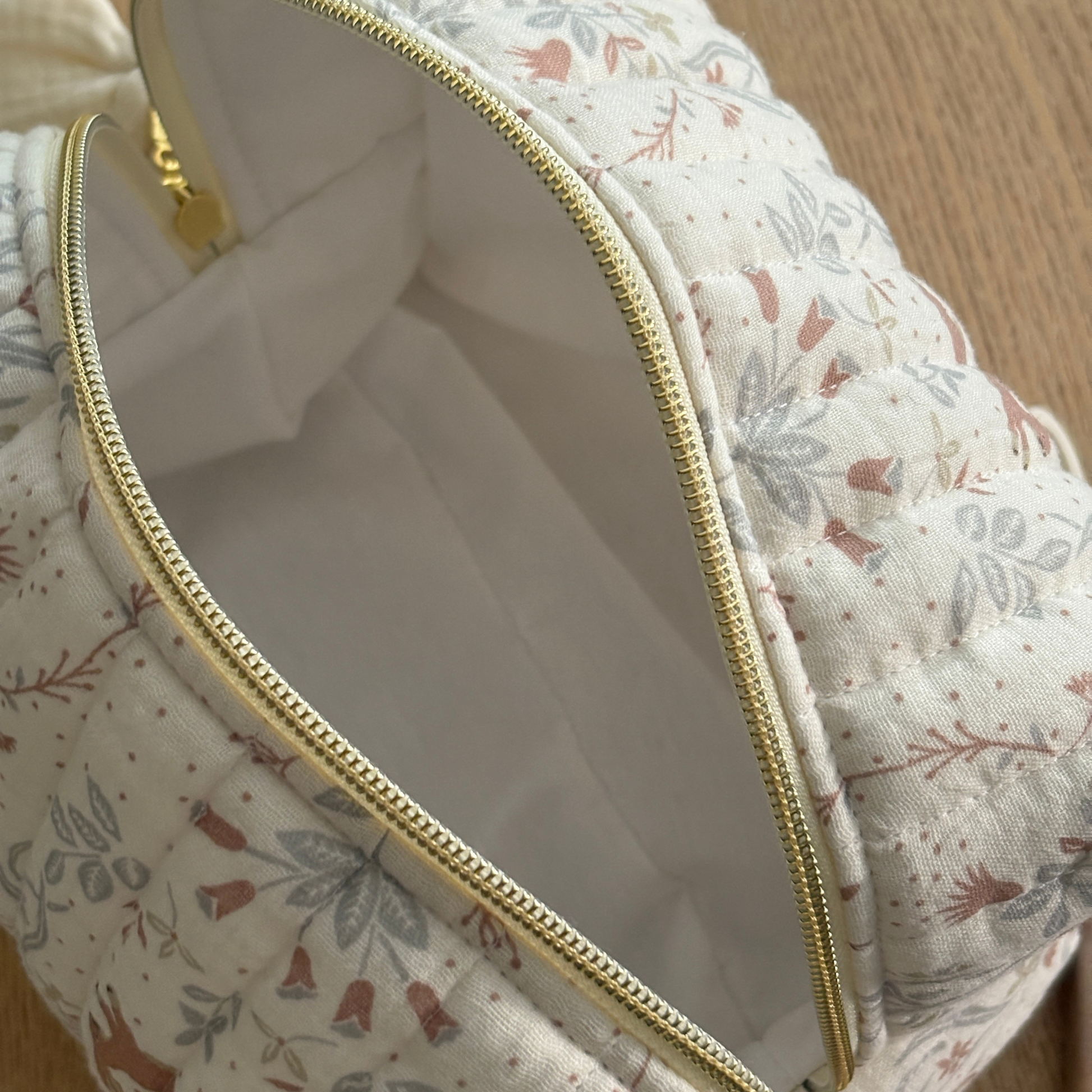 On craque pour cette magnifique trousse de toilette matelassée entièrement faite à la main en gaze de coton écrue